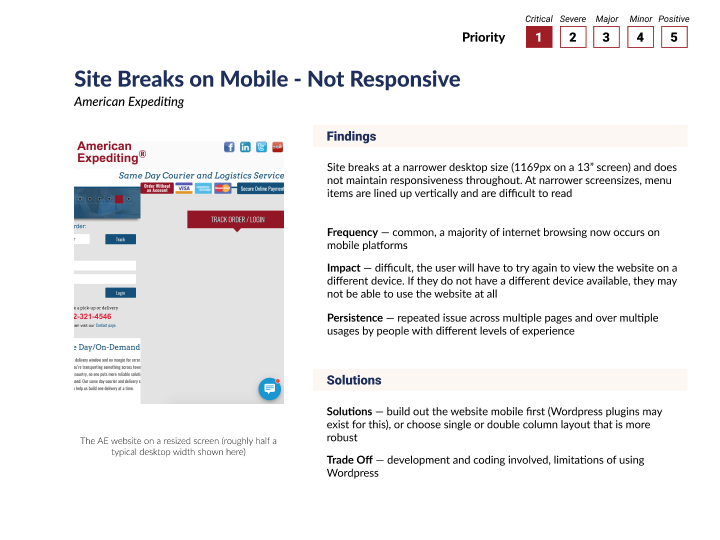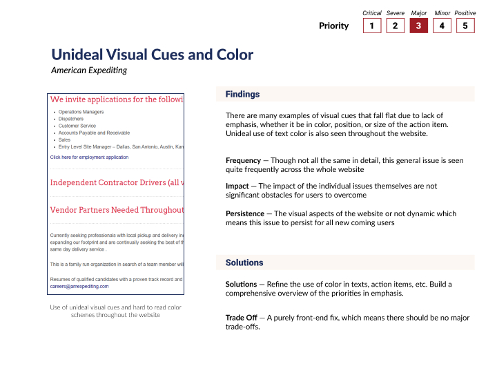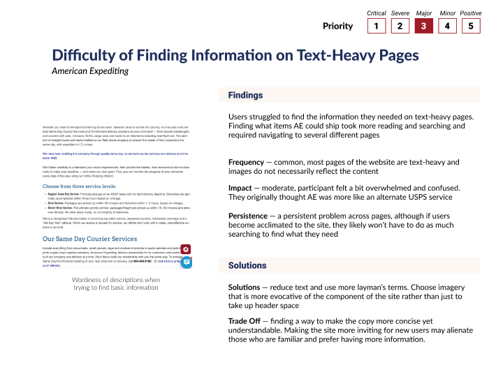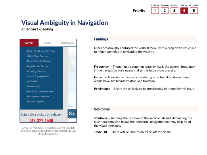 The usability findings were organized and prioritized based on the frequency of occurrence and level of impedance to the user experience. Our team determined the three that were of high priority and more effectively fixed by our redesign.