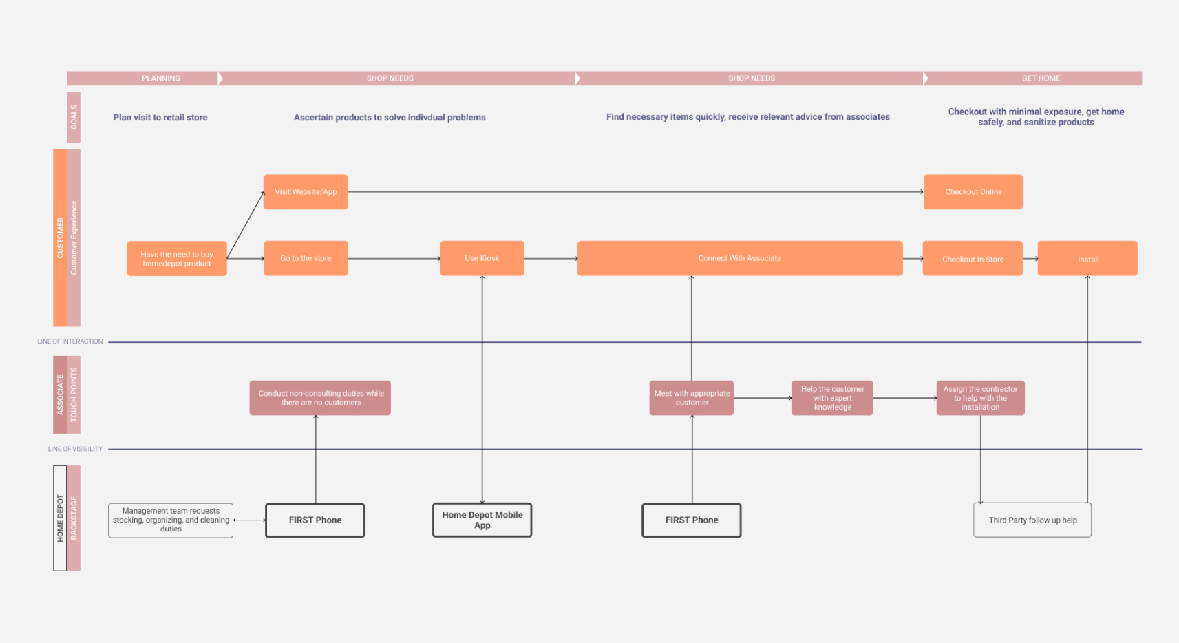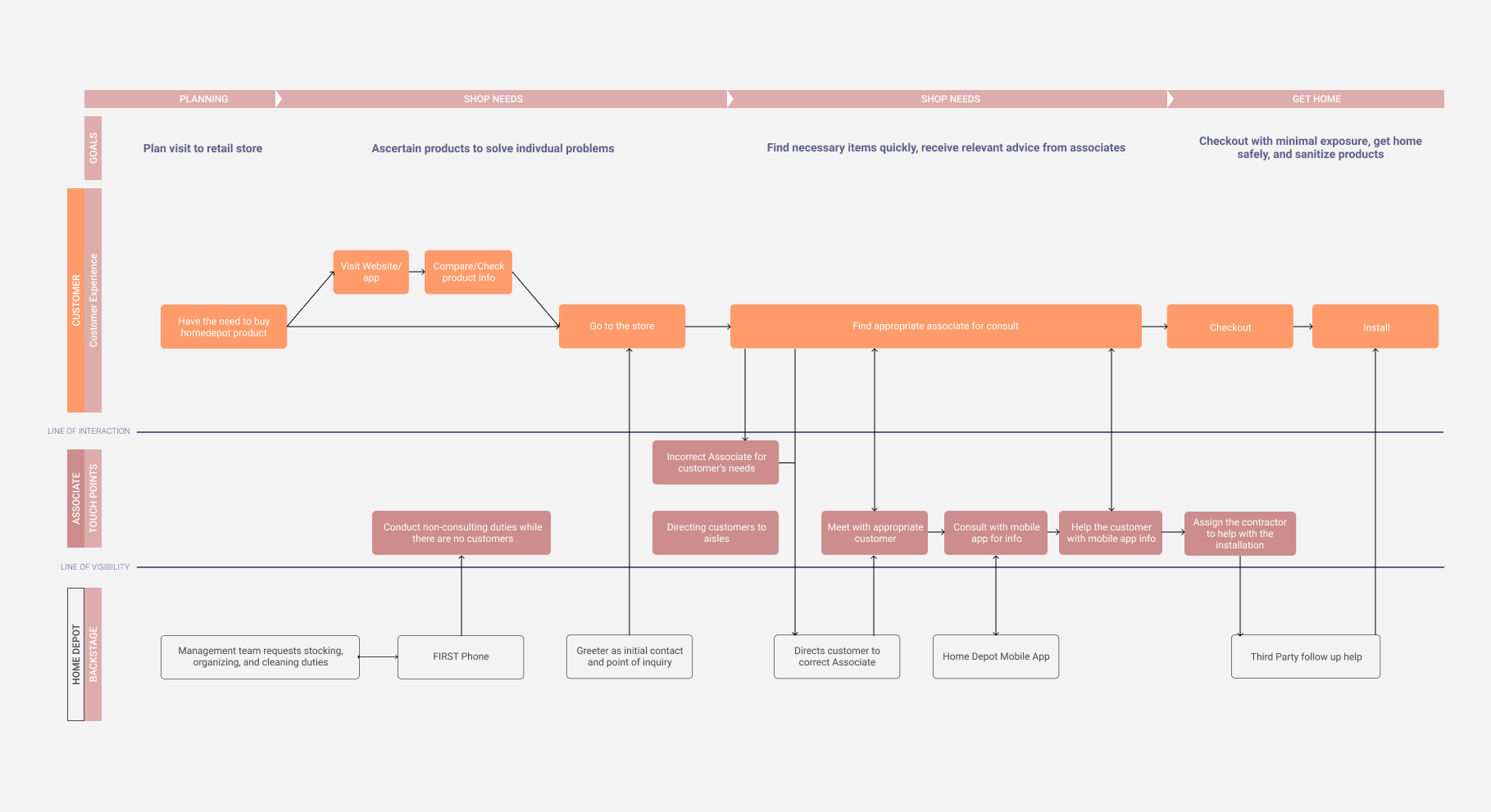 Our conversations and interviews with customers, in-store associates, service providers, and store managers revealed the daily dynamics between intra-personal interactions as customers aim to have their needs met. A big reveal was that although most needs that would fulfill expectations exist within the service ecosystem of Home Depot, and the mobile app is not fully utilized.
